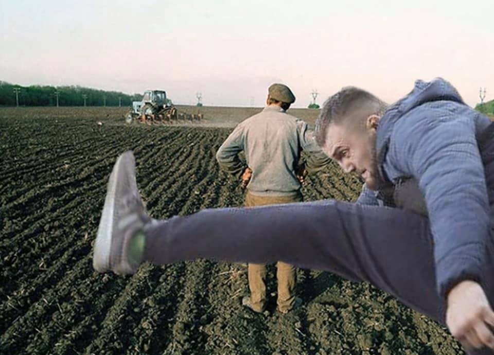 На картинці зобразили одного з учасників сутичок з поліцією на тлі поля. Він в цікавій позі крокує по землі, а за ним оре трактор.
