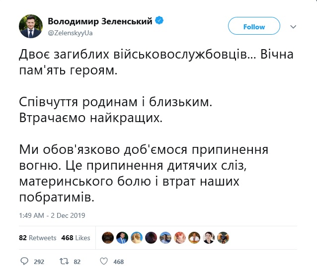 На загибель бійців "Альфи" відреагував також президент України Володимир Зеленський. "Ми обов'язково доб'ємося припинення вогню. Це припинення дитячих сліз, материнського болю і втрат наших побратимів", - написав глава держави в своєму акаунті в Twitter, висловивши співчуття сім'ям загиблих.