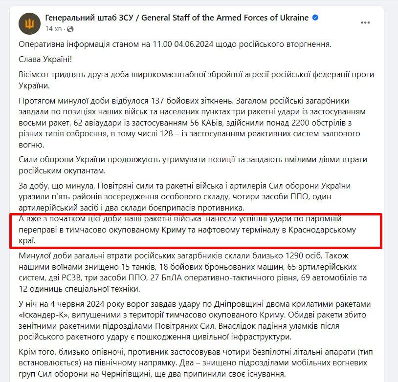 Сили оборони України прокоментували ситуацію з повідомленням від Генштабу ЗСУ, яке з"явилося на офіційній сторінці Генштабу ЗСУ у Фейсбуці 4 червня 2024 року, а потім його прибрали – у повідомленні йшлося про повторне ураження поромної переправи в тимчасово окупованому Криму та нафтового термінала у Краснодарському краї Росії.
