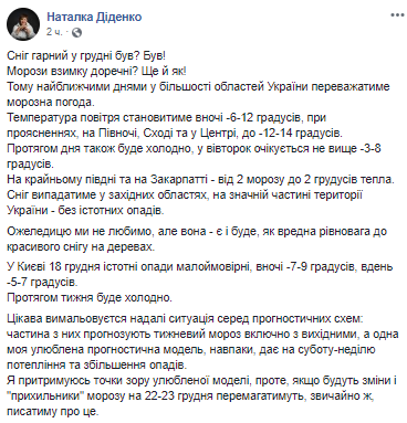 "Цікава вимальовується надалі ситуація серед прогностичних схем: частина з них прогнозують тижневий мороз включно з вихідними, а одна моя улюблена прогностична модель, навпаки, дає на суботу-неділю потепління та збільшення опадів. Я притримуюсь точки зору улюбленої моделі, проте, якщо будуть зміни і "прихильники" морозу на 22-23 грудня перемагатимуть, звичайно ж, писатиму про це", - написала синоптик.