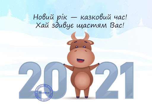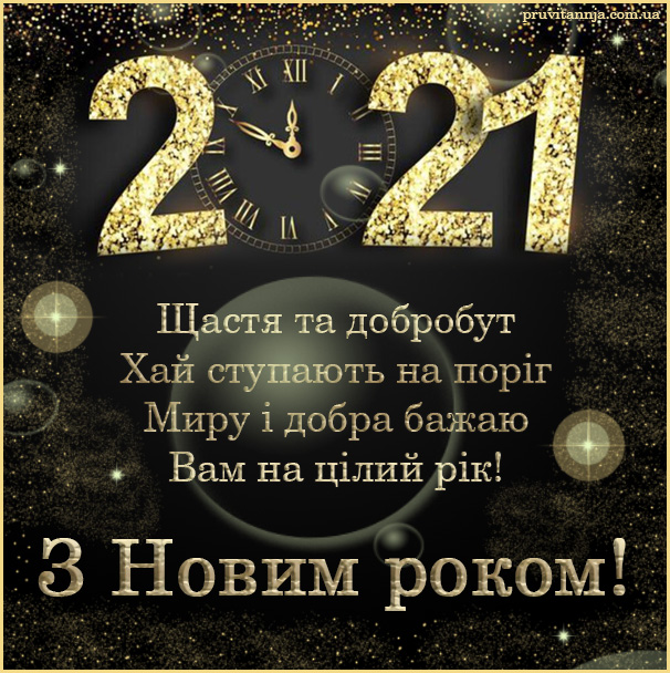 З Новим роком! Нехай це свято принесе вам тільки радісні миті, замітаючи білим снігом всі турботи, печалі й негаразди року, що минає. Бажаю, щоб любов завжди зігрівала серце, душа співала від радості і життя засяяло, як зірки на небі.
