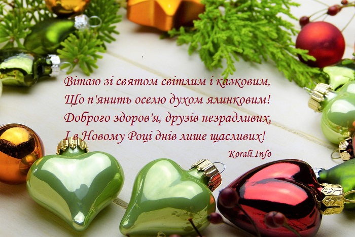 З Новим роком! Хай в цьому році нас чекає багато щастя, удачі, посмішок, світла і тепла. Хай він буде наповнений яскравими фарбами, приємними враженнями і радісними подіями. Бажаю всім нам у Новому році бути здоровими, красивими, коханими та успішними!