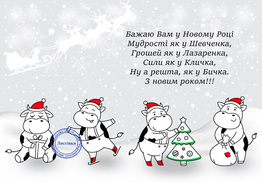 Бажаю, щоб Бик до тебе дійшов тверезим, щоб в мішку його для тебе виявилася купа подарунків, щоб ялинка не згоріла, не пропало олів'є, щоб гірлянди не закоротити, щоб не нудило від шампанського, щоб з ранку не було похмілля, щоб завжди вдавалося тобі залишатися бадьорим огірком, а не консервованим тунцем. Всіх благ в Новому році та нереального щастя!