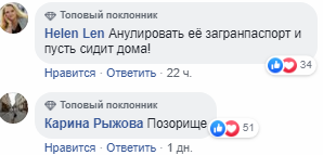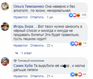 "Вона напевно і без алкоголю, по життю, ненормальна", "Ось таких потрібно заносити в чорний список і ніколи і нікуди не продавати квитки! Це буде правильно, нехай пішки ходить!", "Та вирубили її на*єр, і мовчки далі летіли", "Анулювати її закордонний паспорт і нехай сидить вдома!", "Позорище", - пишуть коментатори.