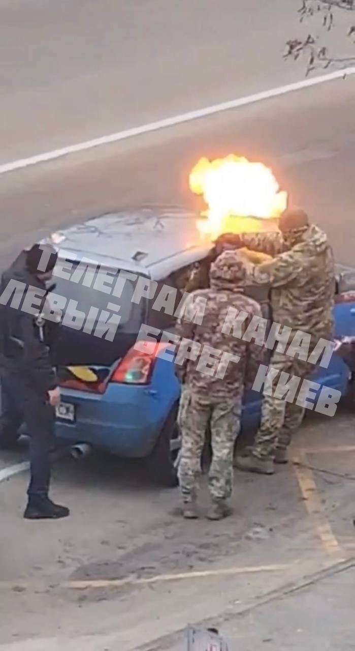 Як пишуть місцеві Telegram-канали, правоохоронці з особами у військовій формі хотіли спочатку змусити водія вийти з авто. Потім намагались добитися свого за допомогою газу, підпаливши його. Авто не загорілося.