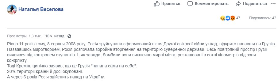 "Август 2008 року. Російські визволителі звільняють Грузію від соку, автотранспорту та цінних речей. До розграбування Донецька і героїчного взяття "Метро" ще 6 років", - зауважила вона.