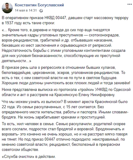 "Тобто, жила людина в родині. Сім'ю розкуркулили, батьків швидше за все заслали, підліток став волоцюгою і злодійкою. Бродяжити та красти - це звичайно не дуже добре, але і на розстріл м'яко кажучи не тягне. Але під наказ 00447 відмінно підходило: невиправний, на думку радянської влади, рецидивіст, даремний в прекрасному радянському суспільстві. "Служба очищення" в дії ", - пише Богуславський.