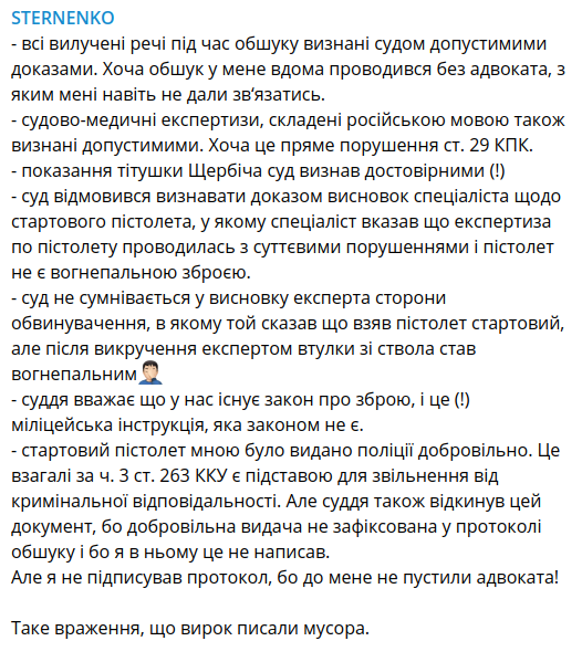 Стерненко наполягає на тому, що при розгляді справи судом було допущено ряд порушень, зокрема не було устено думку фахівця про те, що стартовий пістолет, який був виданий добровільно, не є вогнепальною зброєю, а також те, що всі вилучені речі під час обшуку в його будинку без присутності адвоката визнані судом допустимими доказами