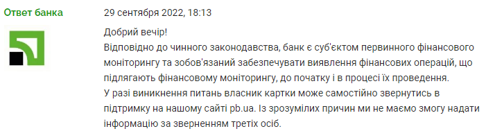 У службі підтримки ПриватБанку відповіли, що банк є суб'єктом первинного фінансового моніторингу та зобов'язаний забезпечувати виявлення фінансових операцій, що підлягають фінансовому моніторингу, до початку та у процесі їх проведення. У разі виникнення питань власник картки може самостійно звернутися на підтримку, а надати інформацію щодо звернення третіх осіб банк не має права.