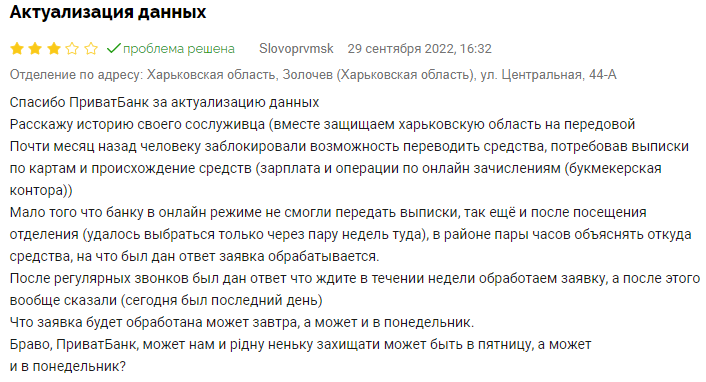 "Мало того, що банку в онлайн-режимі не змогли передати виписки, так ще й після відвідування відділення, куди вдалося вибратися тільки через пару тижнів, в районі кількох годин пояснювати, звідки кошти, на що була дана відповідь, що заявка обробляється", - зазначається у скарзі.