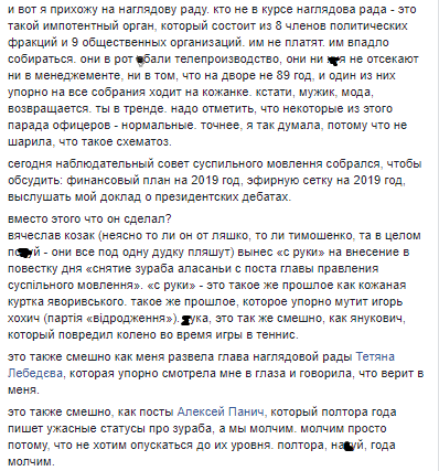 "Сьогодні наглядова рада суспільного мовлення зібрався, щоб обговорити: фінансовий план на 2019 рік, ефірну сітку на 2019 рік, вислухати мою доповідь про президентські дебати.