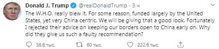 "ВООЗ реально профукала ситуацію. З якоїсь причини, хоча фінансують організацію в основному США, вона дуже зосереджена на Китаї", - написав Трамп.