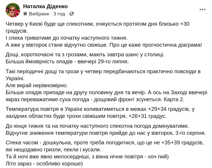 Про це на своїй сторінці в Facebook написала синоптик Наталія Діденко.