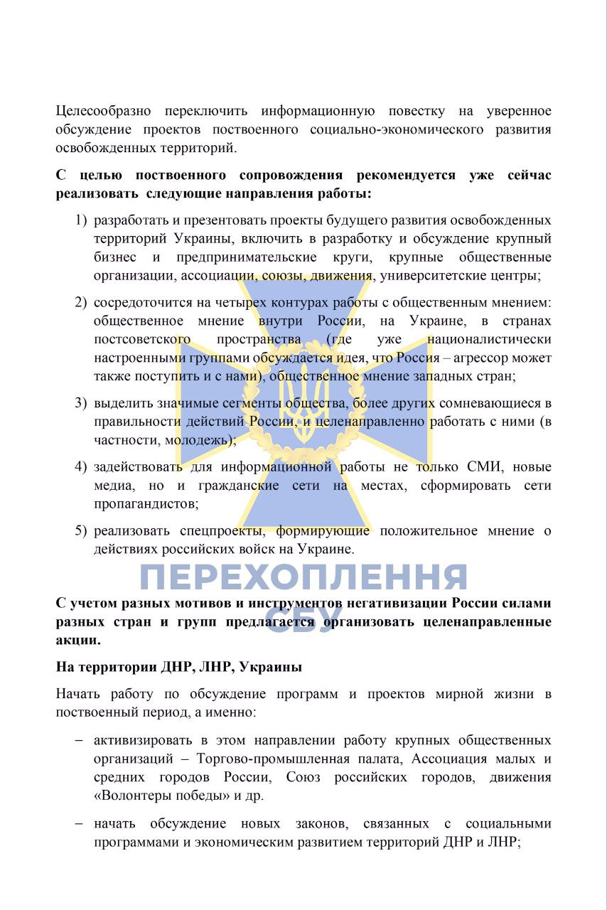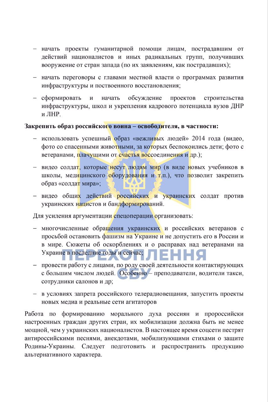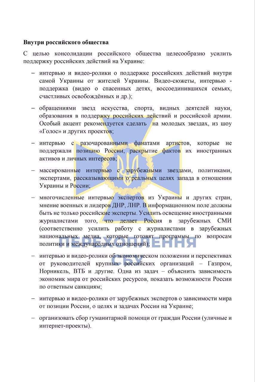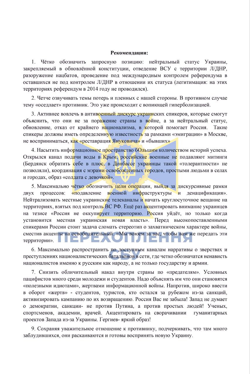 Служба безпеки України отримала доступ до пропагандистських методичок, створених російськими спецслужбами, про "правильне висвітлення спецоперації" в України. Однак співробітники ФСБ РФ визнають, що їхній план провалився, і тепер намагаються знайти нові виправдання повномасштабної війни та воєнних злочинів російських окупантів.