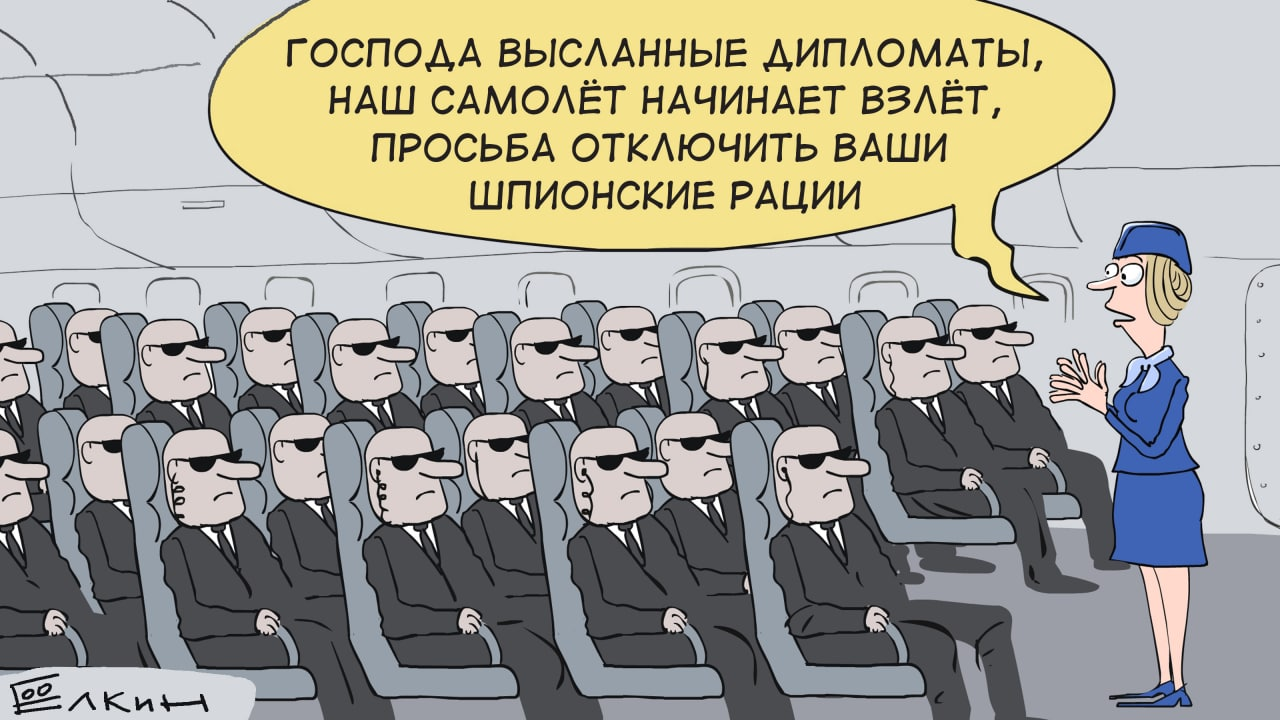 На ній в літаку зобразили всіх російських дипломатів, які виглядають як спецагенти. На малюнку стюардеса просить висланих дипломатів "відключити свої шпигунські рації".