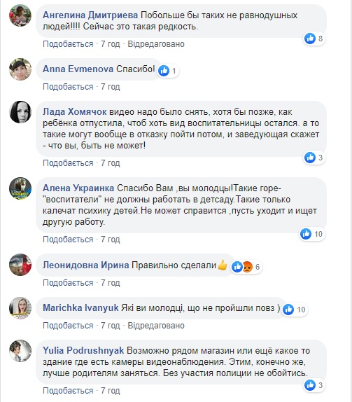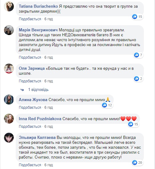 "Спасибі Вам, ви молодці! Такі горе-"вихователі" не повинні працювати в дитсадку. Такі тільки калічать психіку детей.Но може впорається, нехай йде і шукає іншу роботу", - пишуть в коментарях.