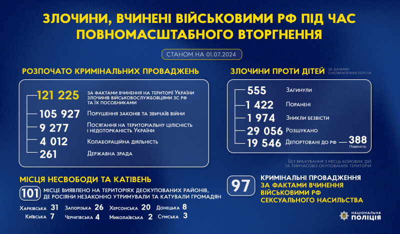 "З початку повномасштабного вторгнення росії в Україну слідчі Національної поліції України розпочали 121 125 кримінальних проваджень за фактами вчинення на території України злочинів військовослужбовцями збройних сил російської федерації та їхніми пособниками", - йдеться в повідомленні НПУ.
