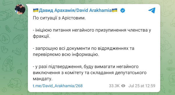 Голова фракції "Слуга народу" Давид Арахамія відреагував на скандал і заявив, що ініціює питання про зупинення членства Арістова у фракції, а також перевірить оприлюднену журналістами інформацію. Якщо факт відпочинку Арістова на Мальдівах підтвердиться, Арахамія обіцяв вимагати його виключення із комітету та складання депутатського мандата.