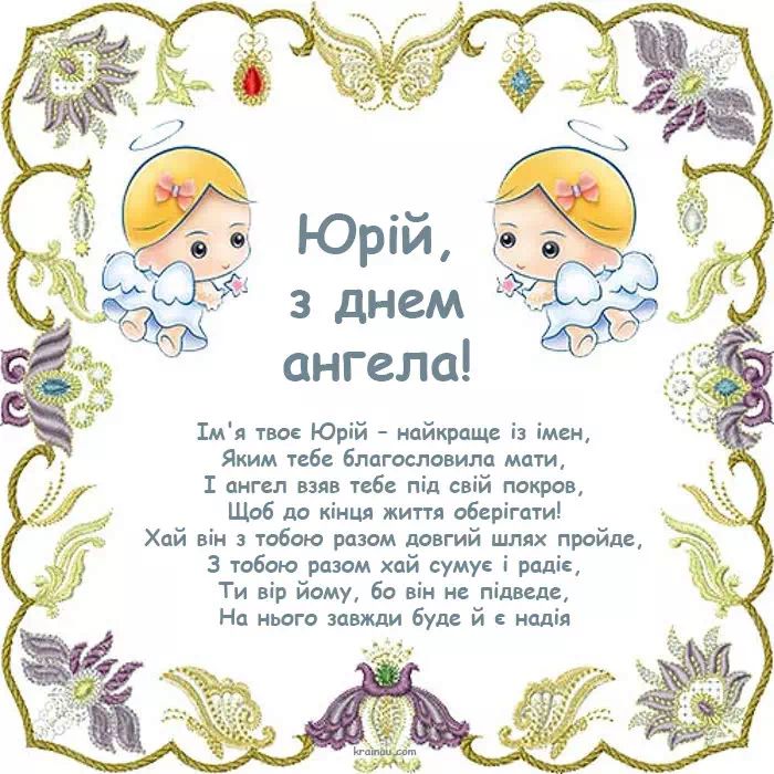 З Днем ангела, Юрочко! Нехай кожну мить тобі приносить сотні шансів зробити життя ще яскравішим і щасливішим! Нехай будь-яка хвилина дарує тільки удачу та море позитиву! Будь сильний і духом, і тілом, бажаю міцного здоров'я та благополуччя у всьому!