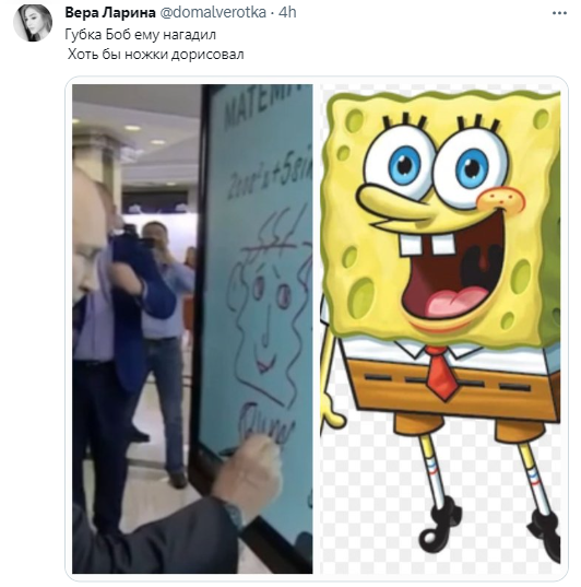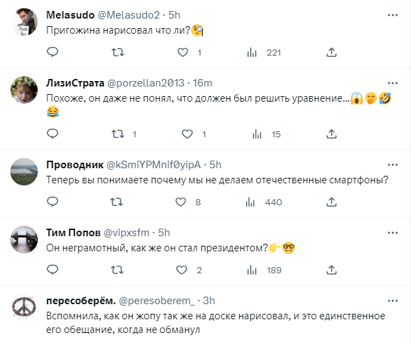 У мережі не могли пройти повз мистецтв Путіна, вгадуючи, що саме міг намалювати президент країни-агресора. Дехто вважає, що це звичайний автопортрет або ж портрет голови ПВК "Вагнера" Євгена Пригожина. Також не виключено, що Путін міг намалювати: а) щасливого "ватника"; б) Губку Боба; в) колобка. З'явилися навіть прихильники теорії, що Путін явно не зрозумів завдання і таким чином просто вирішив приклад на дошці. Однак усі зійшлися на думці, що у 2013 році путінський вигляд "кішки позаду" був набагато високохудожніший.