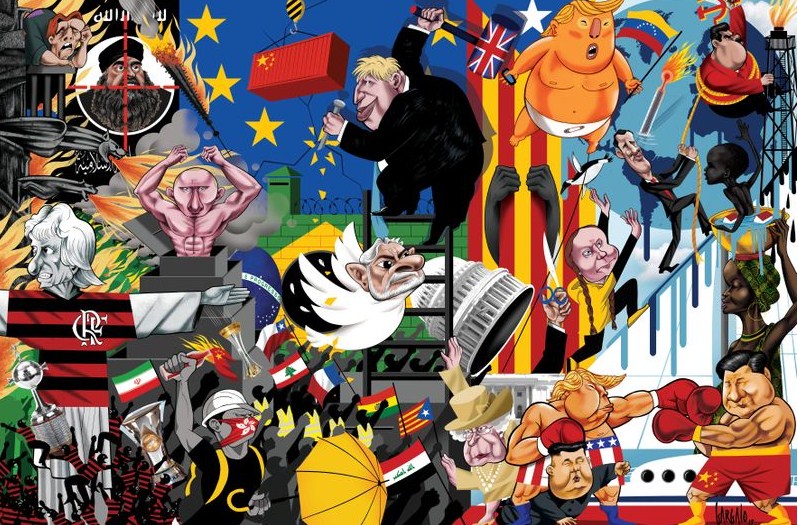 Так, він зобразив зліва направо: протести в Гонконзі; ліквідацію лідерів терористів ІДІЛ; Путіна, який в традиційному для себе стилі топлес вискакує з складаної коробки, як чортик з табакерки; прем'єра Великобританії Бориса Джонсона, який "розколює" Євросоюз; протести "жовтих жилетів"; боротьбу за незалежність Каталонії; Трампа, який нібито через свої примхи перевищує повноваження; також американський президент тут згаданий в контексті торговельної війни з Китаєм; активістку Грету Тунберг в її традиційному плащі від дощу з пластика, що не розкладається в природних умовах; і так далі.