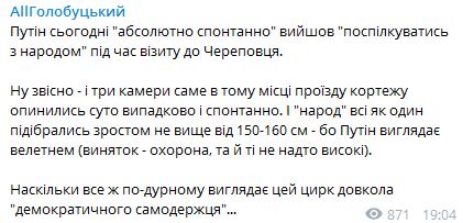 "Путін сьогодні "абсолютно спонтанно" вийшов "поспілкуватись з народом" під час візиту до Череповця. Ну звісно - і три камери саме в тому місці проїзду кортежу опинились суто випадково і спонтанно. І "народ" всі як один підібрались зростом не вище від 150-160 см - бо Путін виглядає велетнем (виняток - охорона, та й ті не надто високі. Наскільки все ж по-дурному виглядає цей цирк довкола "демократичного самодержця", - пише він.