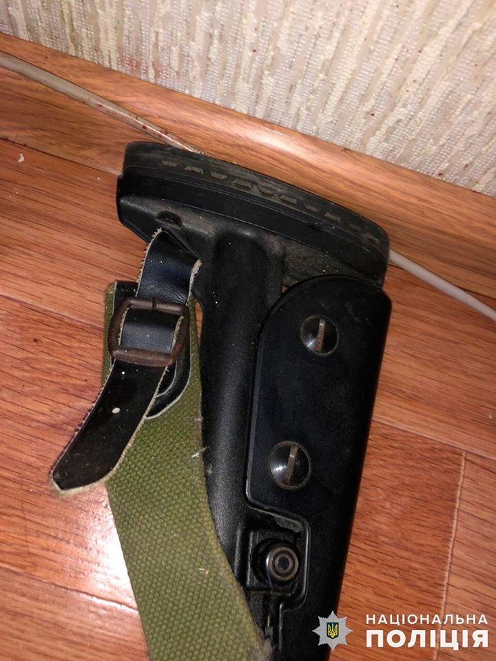 Під час огляду місця події в квартирі потерпілого поліція виявила помпову рушницю, гранату Ф-1, патрони до пістолета травматичної дії і кобуру.