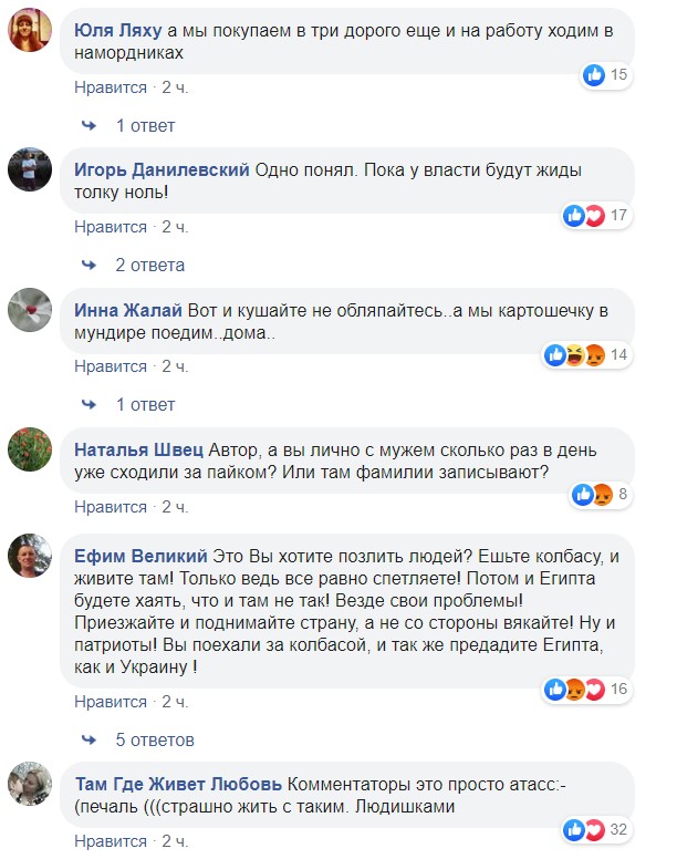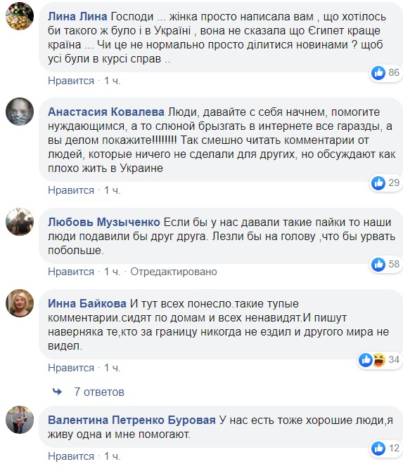 "До складу якого входить 1 кг цукру, чай, 2 пакети рису або макаронних виробів, томатна паста, спеції, пляшка олії, сухе молоко, тахина (місцевий соус), бульйонні кубики.... І це все в одні руки!! Багато ресторанів годують людей абсолютно безкоштовно своїми обідами щодня, якщо потрібна доставка додому, то організована безкоштовна доставка обідів прямо до будинку!! Ось вам і країна третього світу!!! Якого тоді світу за рахунком буде Україна ?? Прикро усвідомлювати це!!! Ось що ми взяли сьогодні, в якості допомоги від уряду Єгипту... І таку допомогу кожна людина може отримати кожен день", - написала вона.