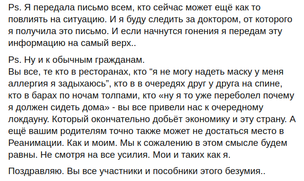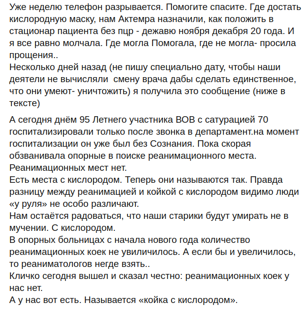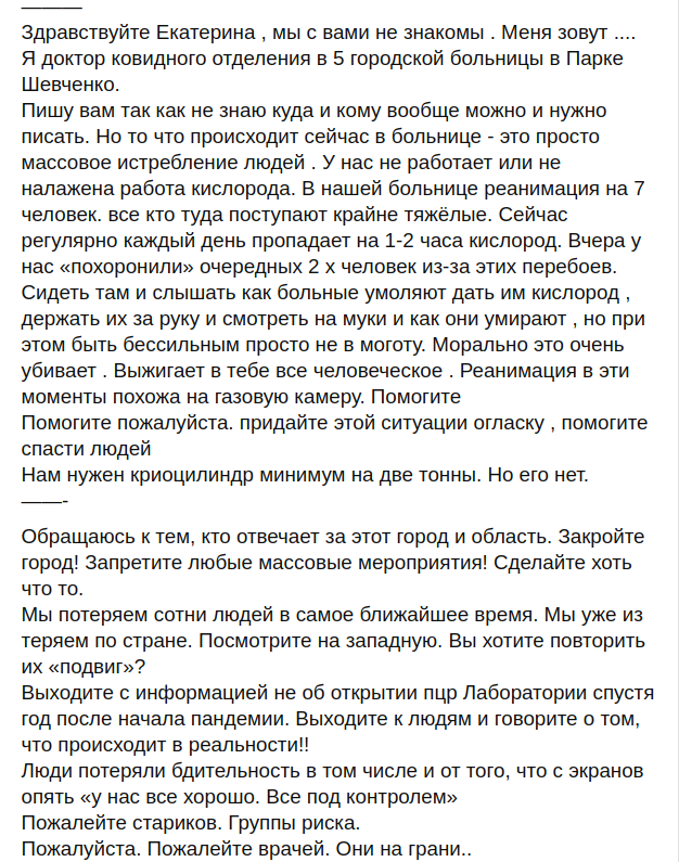 Пишу вам, бо не знаю куди і кому взагалі можна і потрібно писати. Але те, що відбувається зараз в лікарні - це просто масове винищення людей. У нас не працює або не налагоджена робота кисню. У нашій лікарні реанімація на 7 осіб. Всі, хто туди надходять, вкрай важкі. Зараз регулярно кожен день пропадає на 1-2 години кисень. Вчора у нас "поховали" чергових 2-х осіб через ці перебої. Сидіти там і чути, як хворі благають дати їм кисень, тримати їх за руку і дивитися на муки і як вони вмирають, але при цьому бути безсилим, просто не під силу. Морально це дуже вбиває. Випалює в тобі все людське. Реанімація в ці моменти схожа на газову камеру. Допоможіть. Допоможіть будь ласка. Надайте цій ситуації розголосу, допоможіть врятувати людей. Нам потрібен криоциліндр мінімум на дві тонни. Але його немає".