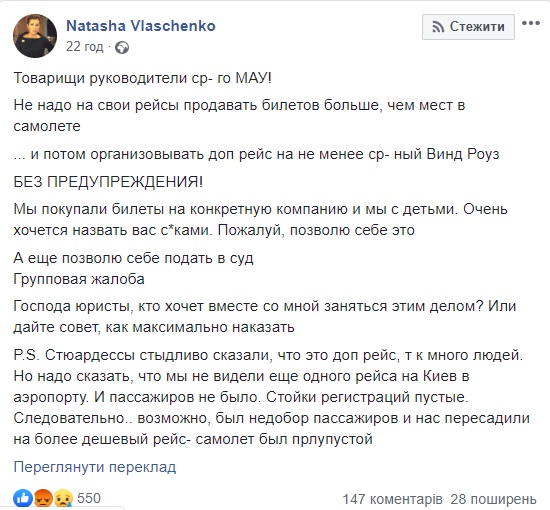 "Ми купували квитки на конкретну компанію, і ми з дітьми. Дуже хочеться назвати вас зс*ками. Мабуть, дозволю собі це. А ще дозволю собі подати в суд. Групова скарга", - пригрозила журналістка, закликавши юристів допомогти їй "максимально покарати" авіаперевізника.