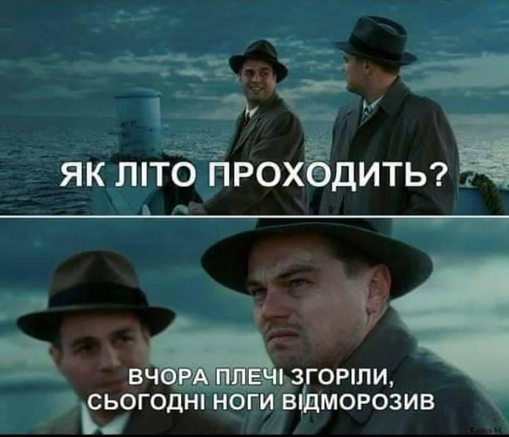 "Як літо проходить?" - "Вчора плечі обгоріли, сьогодні ноги відморозив", - говорить діалог двох чоловіків в капелюхах.