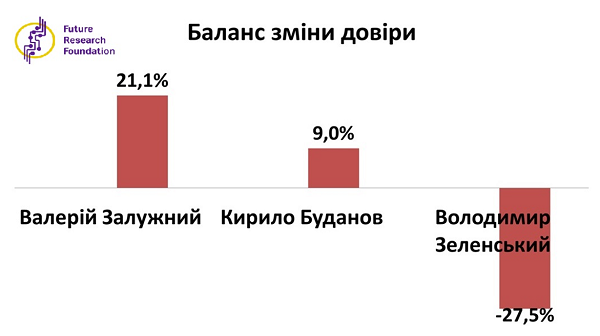 Довіра українців до Валерія Залужного та Кирила Буданова продовжує зростати. Згідно з даними соціологічного опитування, проведеного агенцією Info Sapiensу січні в межах співпраці з благодійною організацією "Фонд досліджень майбутнього", саме ці дві персоналії мають найвищий позитивний баланс зміни довіри.