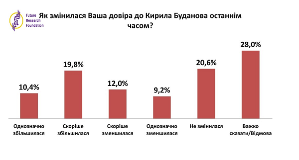Разом з цим зростає довіра до начальника ГУР Міноборони Кирила Буданова. ГУР постійно проводить успішні операції, що не залишається непоміченим серед українців. За останній час 30,2% респондентів почали більше довіряти Буданову, тоді як 21,2% заявили про зменшення довіри.