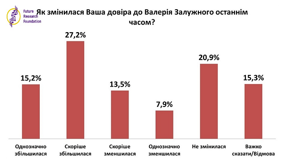 Колишній головнокомандувач ЗСУ Валерій Залужний, який нині обіймає посаду посла України у Великій Британії, залишається в центрі суспільної уваги. Його регулярні публічні виступи, численні зустрічі та спогади українців про успіхи ЗСУ у 2022 році сприяють зміцненню його авторитету. Опитування показало, що 42,4% громадян почали більше довіряти Залужному, водночас рівень довіри до нього знизився у 21,4% опитаних.