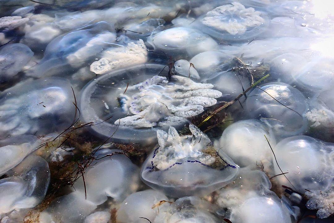 У мережі продовжують публікувати фото і відео з узбережжя Азовського моря, де вода через нашестя медуз місцями перетворилася на справжній кисіль.
