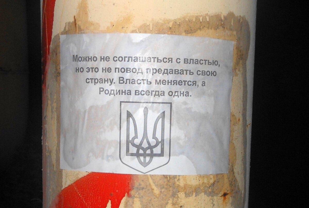 На знімку можна побачити стовп електропередач, на якому наклеєна листівка зі словами: "Можна не погоджуватися з владою, але це не привід зраджувати свою країну. Влада змінюється, а Батьківщина завжди одна". Під цією фразою зображено малий герб України - тризуб.