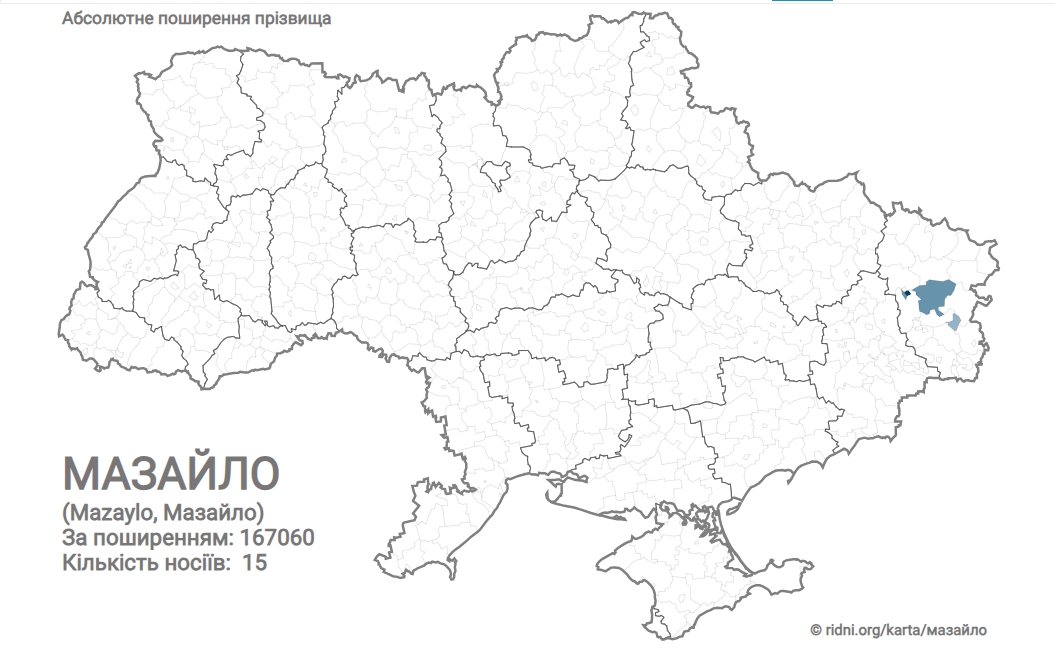 Прізвище Мазайло налічує 15 носіїв. За поширенням займає 167060 місце. Найчастіше зустрічається на Запоріжжі. Поселення компактного проживання: Сєвєродонецьк (8), Смолянинове (2), Лисичанськ (2) Сиротине (2), Луганськ (1). Найпопулярніші імена: Роман, Олена.