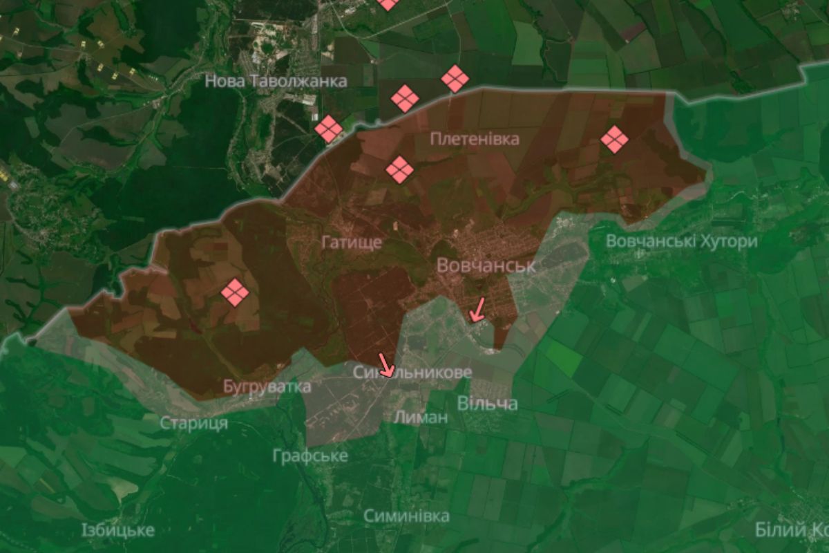 Згідно з оновленими даними мапи, ворог просунувся безпосередньо у місті Вовчанськ на Харківщині, а також поблизу населеного пункту Вільча.