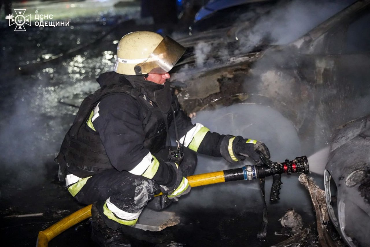 "Ворог знову атакував Одесу ударними безпілотниками. Внаслідок удару зайнялася пожежа на парковці, горіли автомобілі. Також вибито вікна в багатоповерхівці та пошкоджено магазин", – пишуть рятувальники.
