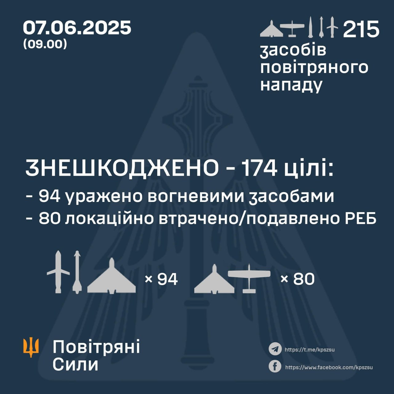 У ніч на 7 червня (із 22:00 6 червня) РФ атакувала Україну 215 засобами повітряного нападу.