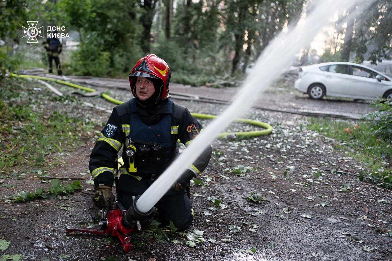 - Святошинський район: внаслідок влучання у 14-поверховий житловий будинок виникла пожежа. Також загорілися автомобілі. Триває гасіння кількох пожеж у нежитлових будівлях.