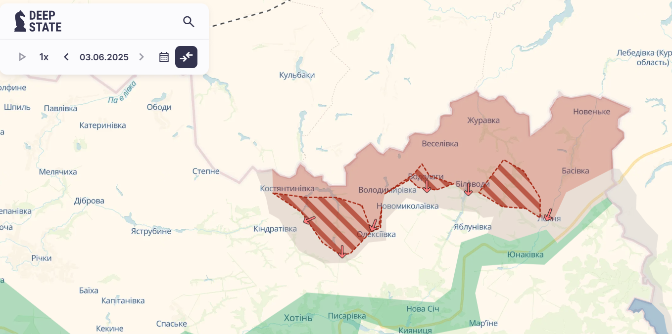 Просування армії противника можна помітити на карті аналітичного ресурсу, переглянувши результати за 3 та 2 червня 2025 року.