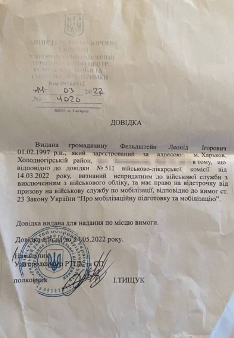 Син Ігоря Фельдштейна – Леонід, як з"ясували журналісти, на початку широкомасштабного вторгнення отримав довідку про інвалідність від Ужгородського ТЦК. Ця довідка дає йому можливість вільно перетинати кордон і проводити багато часу, зокрема, в Іспанії.