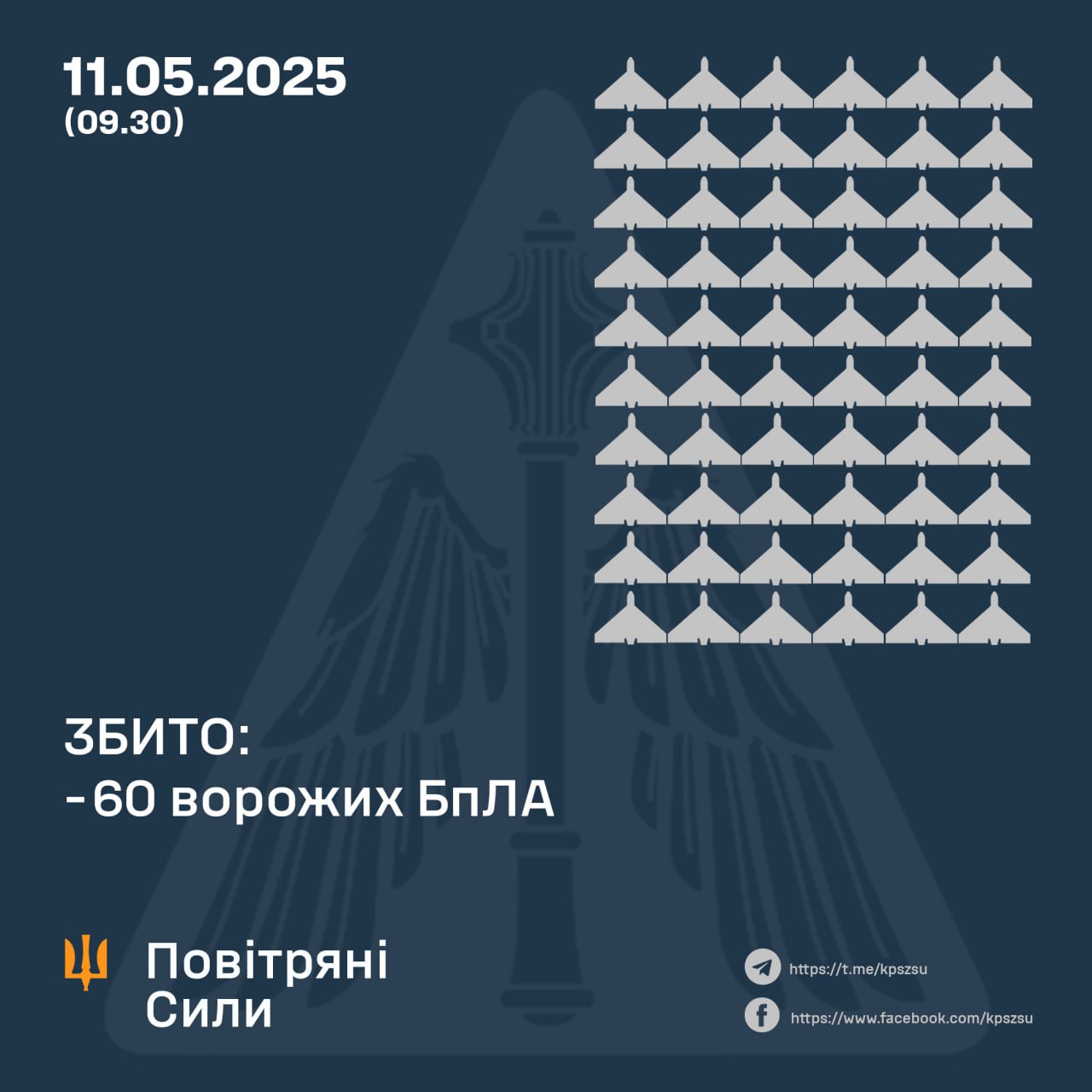 Станом на 09:30 підтверджено збиття 60 ударних БпЛА типу Shahed (безпілотників інших типів) на сході, півночі, півдні та в центрі країни.