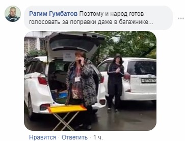 "Тому і народ готовий голосувати за поправки навіть в багажнику", "А чо це я стою? У мене ж через годину обов'язкова операція зі зміни статі! Нам на роботі всім прописали", "Шикарно, варто на нашому телебаченні показувати", - пишуть вони.