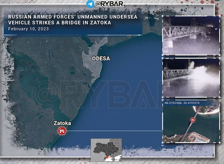 Використання країною-агресоркою Росією морських надводних дронів раніше не фіксувалося, однак увечері 10 лютого низка телеграм-каналів, що висвітлюють повномасштабну війну з проросійської позиції, опублікували відео, де, за їхніми словами, дрон уразив опору мосту під Одесою - у Затоці.