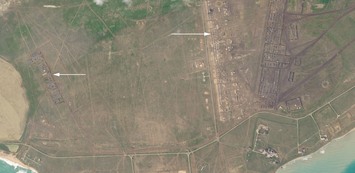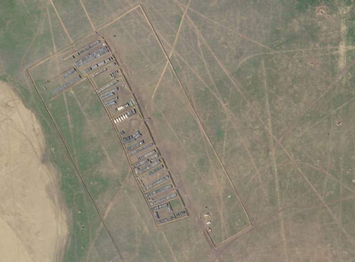 На фото з супутника видно, що Російська Федерація розмістила на території окупованого Криму табір з більш ніж тисячею бойових машин. Вони стоять в обгороджених районах.