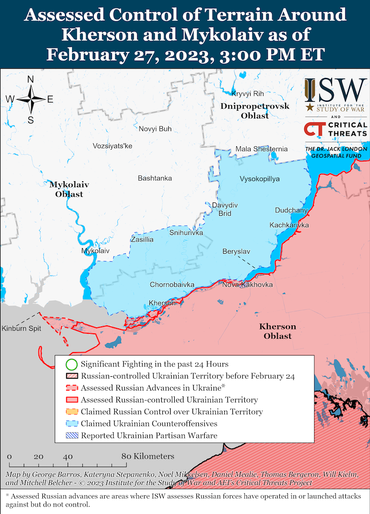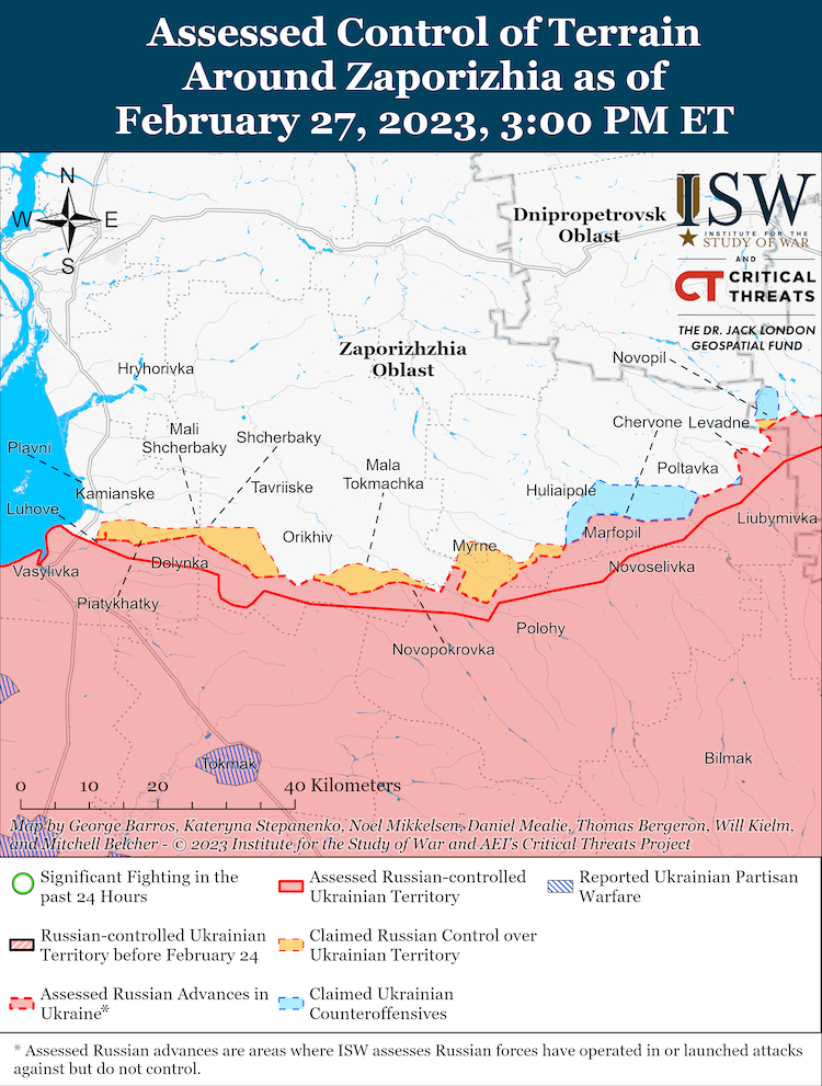 Російські окупанти атакують навколо Бахмута, проте безуспішно. Тим часом у Генштабі України зазначили, що 27 лютого російські війська провели безуспішні наступальні дії в районі Вугледара (30 км на південний захід від Донецька). За словами представника українського Таврійського оборонного угруповання полковника Олексія Дмитрашківського, темп російських операцій у районі Вугледара знизився за останні чотири дні внаслідок поганої погоди, проте тільки за 27 лютого російські загарбники здійснили 17 наземних атак поблизу Вугледару.