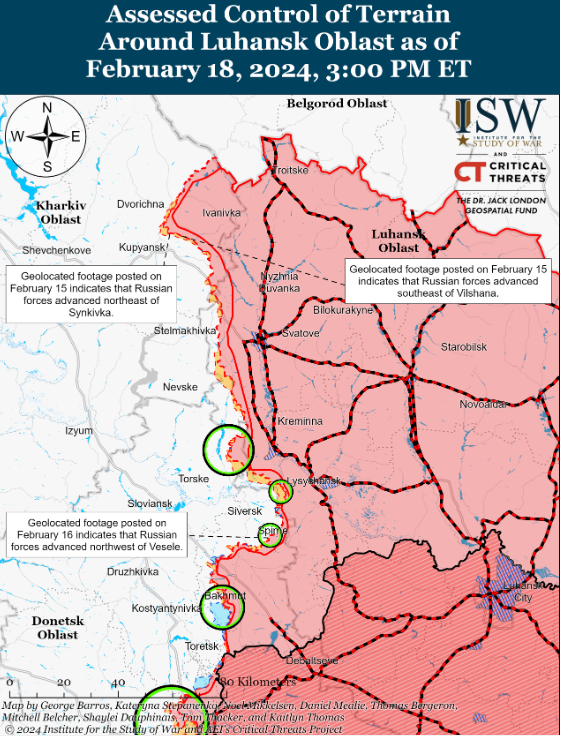 Експерти ISW вважають та кількох українських і західних джерел, що затримка з наданням західної допомоги у сфері безпеки завадили українським військам захистити Авдіївку від російського наступу. Це, зокрема стосується артилерійських боєприпасів та критично важливих систем протиповітряної оборони.