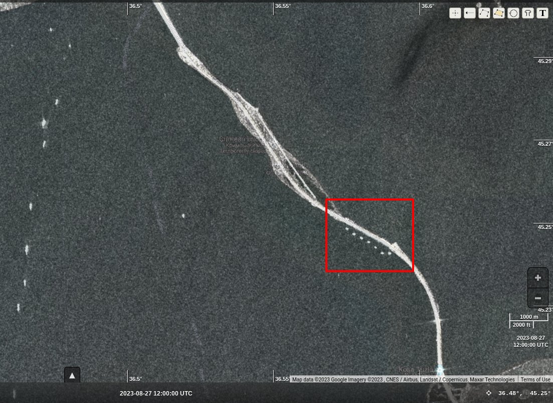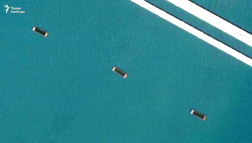 Радіо Свобода опублікувала супутникові знімки сервісу Planet.com високої роздільної здатності, на яких видно, що на південь від мосту встановили баржі, можливо, частково затопивши їх, оскільки глибина в цьому місці не перевищує 2-4 метрів.